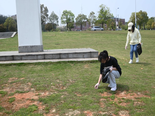 参与人员在学校东门草坪和雕塑楼周边以分组的形式合作捡拾垃圾,以行动服务校园,通过实践于行,传播于心,积极带动身边同学共同参与到爱护校园环境中来,共同营造一个和谐文明、干净整洁的美丽校园。