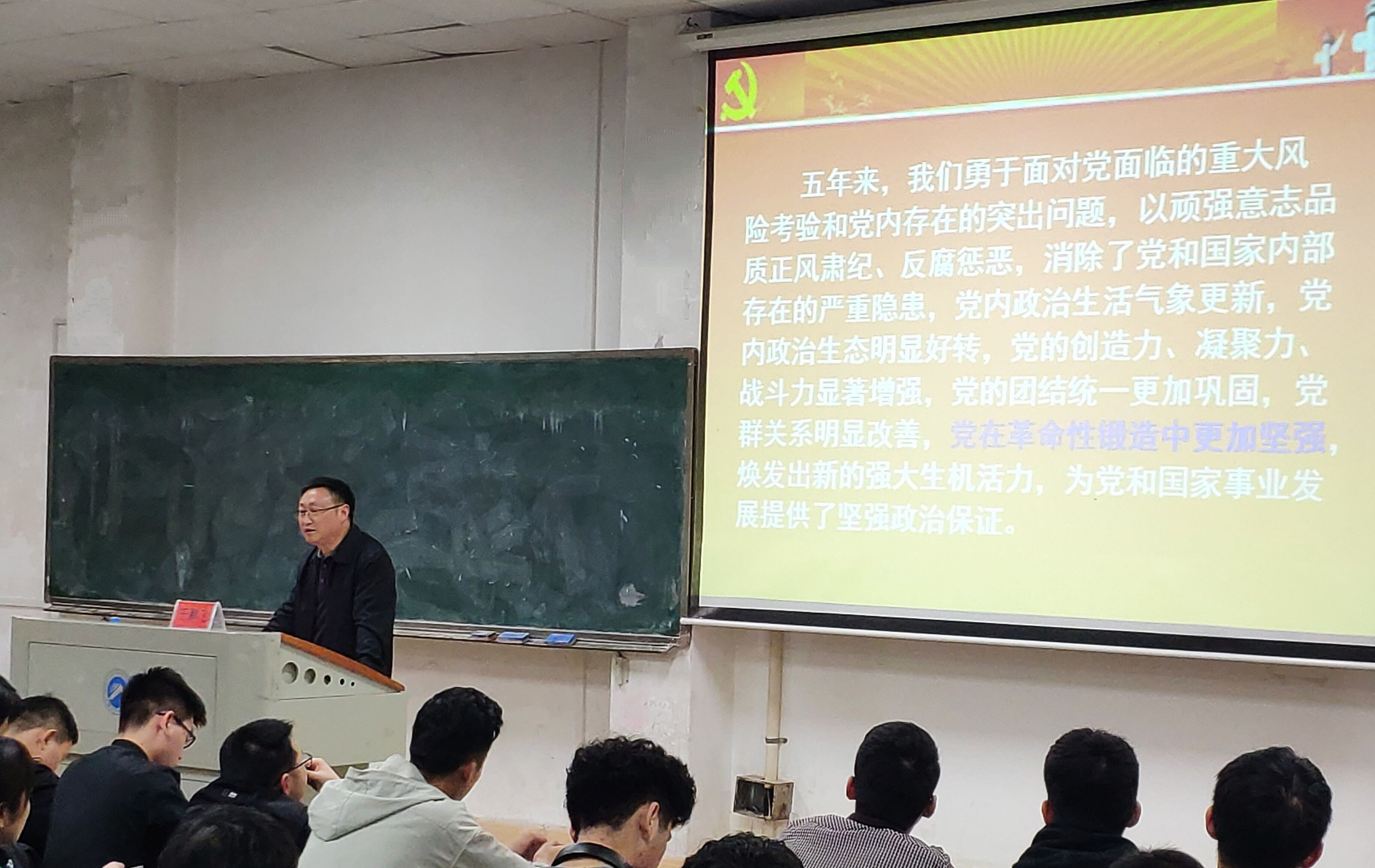 王鹏飞从四个方面进行了讲授,首先分析了我党面临的国际国内重大风险考验和党内存在的突出问题,阐述了以习近平同志为核心的党中央,以非凡的政治魄力和坚韧不拔的意志品格,以“得罪千百人,不负十三亿”的责任担当,紧紧抓住人民群众反映最强烈、对党的长期执政威胁最大的问题,锲而不舍地狠抓落实中央八项规定精神,严明政治纪律和政治规矩,充分发挥巡视利剑的强大威慑作用,坚决严厉惩治腐败,推动全面从严治党取得的重大成果。十八大以来,“打虎”“拍蝇”“猎狐”行动不断发力,腐败毒瘤一个一个被清除,反腐败斗争压倒性态势已经形成并巩固发展。随着一系列党内法规的出台和落实,制度的笼子越织越密、越扎越紧,形成了不敢腐、不能腐、不想腐的有效机制。其次分别从全面从严治党的定位仪和路线图进行了讲述,要求大家一定要把握党的建设“六个层次”的战略部署和抓好“六个从严”的战略举措。最后,对全体学员提出了“拥抱新时代,承担新使命”的责任要求。作为当代大学生,应担负起进行伟大斗争、建设伟大工程、推进伟大事业、实现伟大梦想的历史使命,坚定信念,勤奋刻苦,脚踏实地,练就本领,锤炼品格,勇于担当,努力在实现中华民族伟大复兴的中国梦的生动实践中去放飞青春。