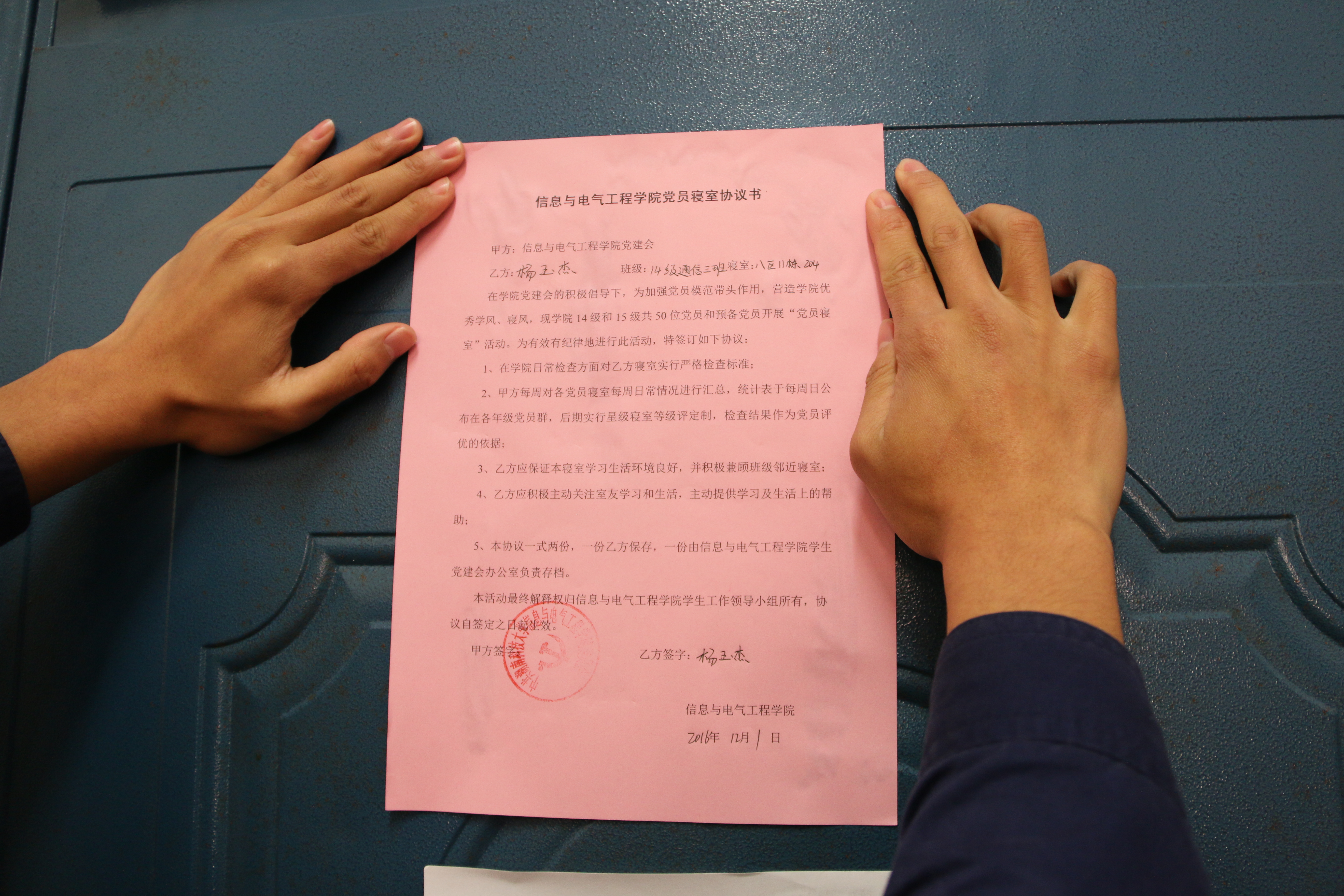 党员寝室的标识分为两种,一种贴在寝室门的外侧,红底金字以示区分,方便其他同学监督;还有一份是“太阳成tyc33455cc党员寝室协议书”,协议书需要所在寝室的党员签字,一式两份,其中一份贴在寝室门内侧,提醒党员同志时时注意自己的言行举止,并发挥党员的先锋模范作用,带动寝室成员搞好寝室卫生,搞好学习,养成良好的作风习惯,另一份交与学院党建会留底存档。