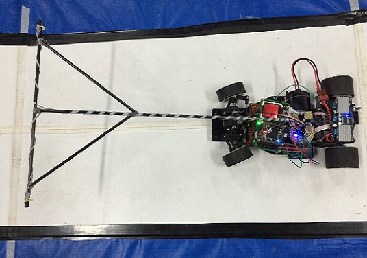 下午开展的“信达杯”智能小车比赛的决赛。比赛从3点开始,参赛队伍来自机电学院、信息学院、物理学院。参赛车辆也形式各异,主要有光电开关、电磁和摄像头,转向方式有万向轮、舵机和差速。其中,由摄像头循迹的智能小车表现十分抢眼,全程仅用时10余秒。