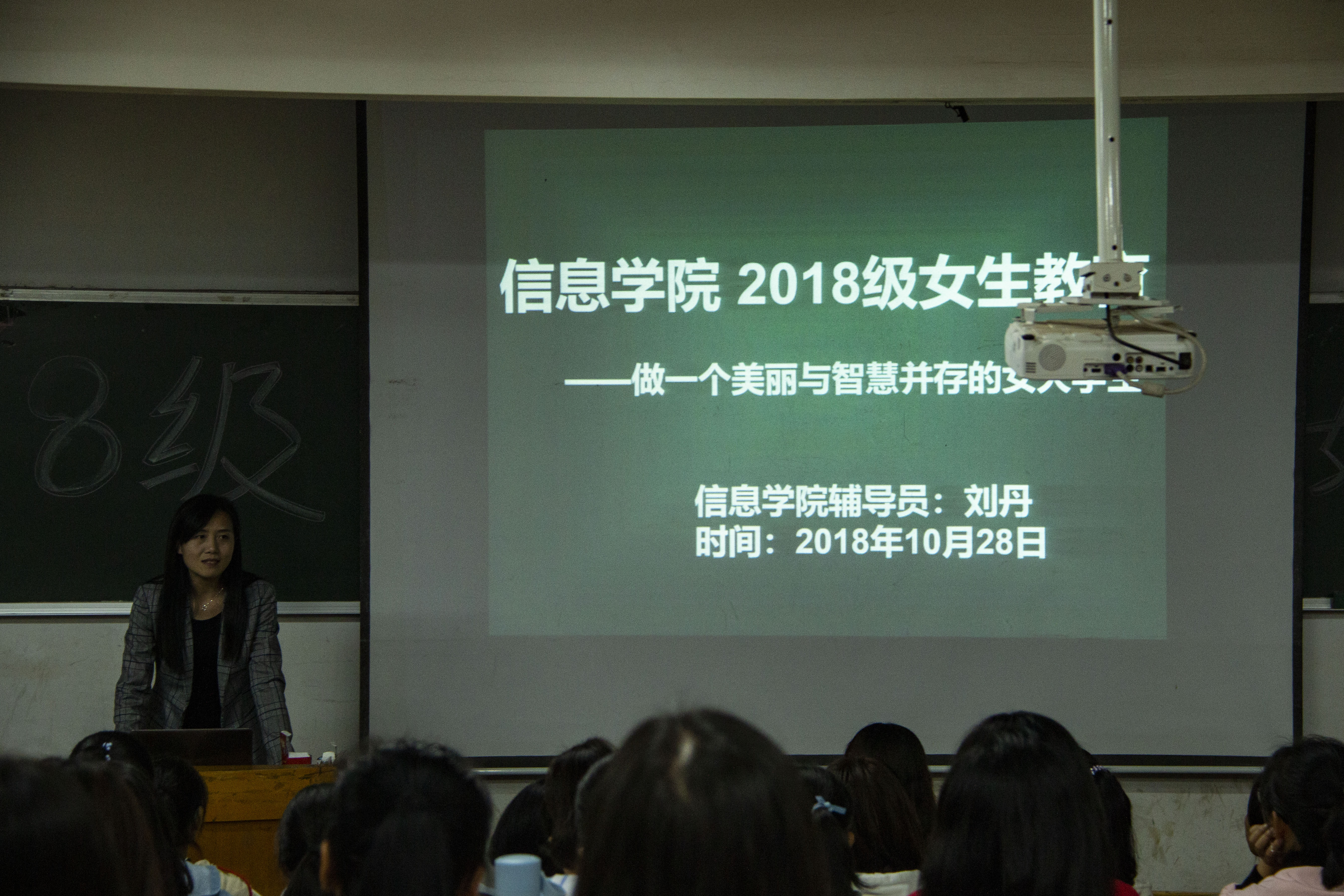 10月28日晚7:00,太阳成tyc33455cc(以下简称“信息学院”)在信息楼二合班召开2018级女生大会。本次大会特邀信息学院学工办老师刘丹及16级四位优秀学生代表参加,2018级全体女生与会。刘丹及优秀学生代表分别就女生的人身安全、心理问题和学习、工作、生活等方面与大家分享交流。