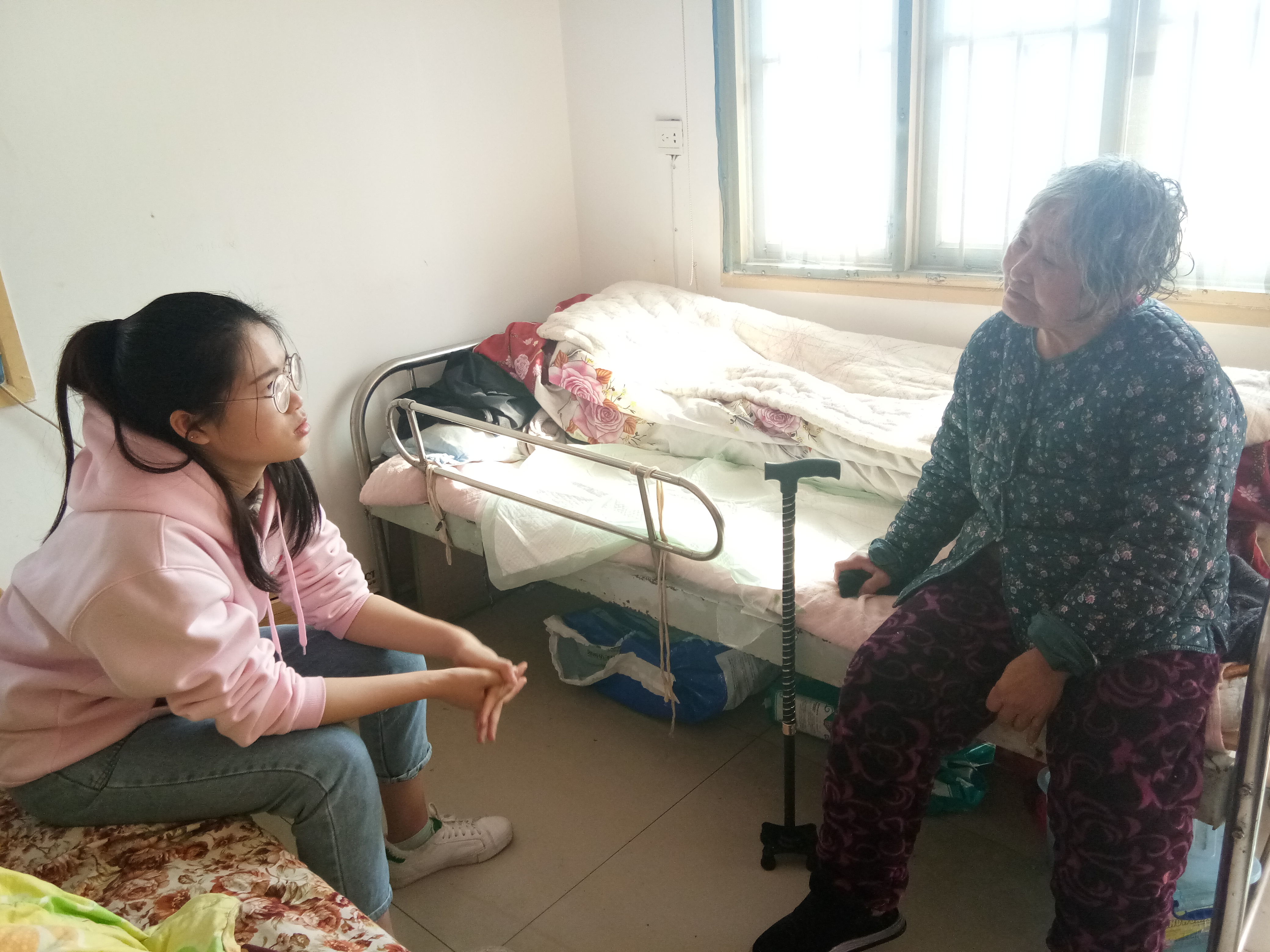 敬老院负责人袁阿姨为志愿者们讲述了“板凳妈妈”许月华的人生经历以及“板凳妈妈”敬老院的相关情况。“板凳妈妈”一岁丧父,自她小时,母亲身体就不好,在别的孩子读书玩耍的年纪,她小小的肩膀就扛起了家里的重任。不幸的是,在她十二岁时,母亲终因病而离开了她。仅在三个月后,她为生计在铁轨上捡煤炭,被火车无情地夺走了双腿,之后便被送进了湘潭市福利院。在福利院里,虽然自己行动不便,可是她拒绝让别人照顾自己,反而给院中的其他人提供了许多帮助。据了解,经她护理过的孤儿达一百三十多个,她后来便一直留在这家敬老院里工作,照顾那些体弱多病的孩子和老人。几年前,她的丈夫被查出肺癌晚期,她每天尽心地照料着丈夫,后来自己也被查出肺癌早期,肺也因此给切去了一半。“她每天都会带着老人做操,她比我都还要精神。”袁阿姨说。如今养老院里有十多个老人,虽然这个养老院规模不大,但是对老人们来说,这里对他们意义非凡。