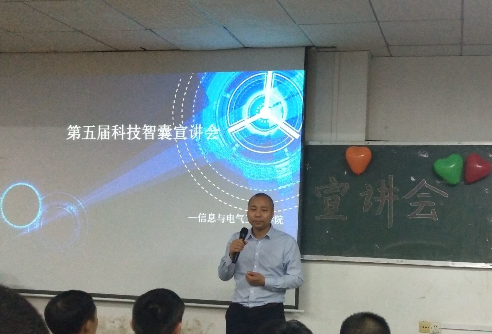 在主持人对本次宣讲会进行简单介绍之后,信息学院院长吴亮红上台致辞,宣布本次“科技智囊”宣讲会正式开始。随后,实验室指导老师卢明介绍了“恩智浦”智能车比赛、“节能减排”、“挑战杯”等一系列比赛,在强调参加科技比赛的重要性时说:“这不但能收获荣誉和奖项,还能充实知识库,转换思维方式和锻炼动手能力,更能让你在与队友的协助合作中收获难得的友谊。”接着,15级电气四班刘文星介绍了“SRIP ”项目申报的相关内容及注意事项,分享了自己在科创方面的经验感悟和科创想法,以幽默的语言和有趣的经历带领在座的同学们走进科创世界。最后,科协副主席刘志发对此次宣讲会进行总结,鼓励同学们多参加科技类竞赛,也希望大家能够进入实验室学习知识,提升自我。