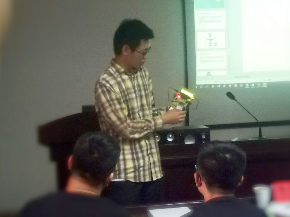 其中,第七组的作品《超声波测距仪》不仅实现了超声波测距,还加入了语音播报模块等创新元素,引起了评委的极大兴趣,评委们纷纷对作品的各个特性进行询问:“这个作品误差多大?共阴极还是共阳极……”参赛选手对此一一作出回答。
