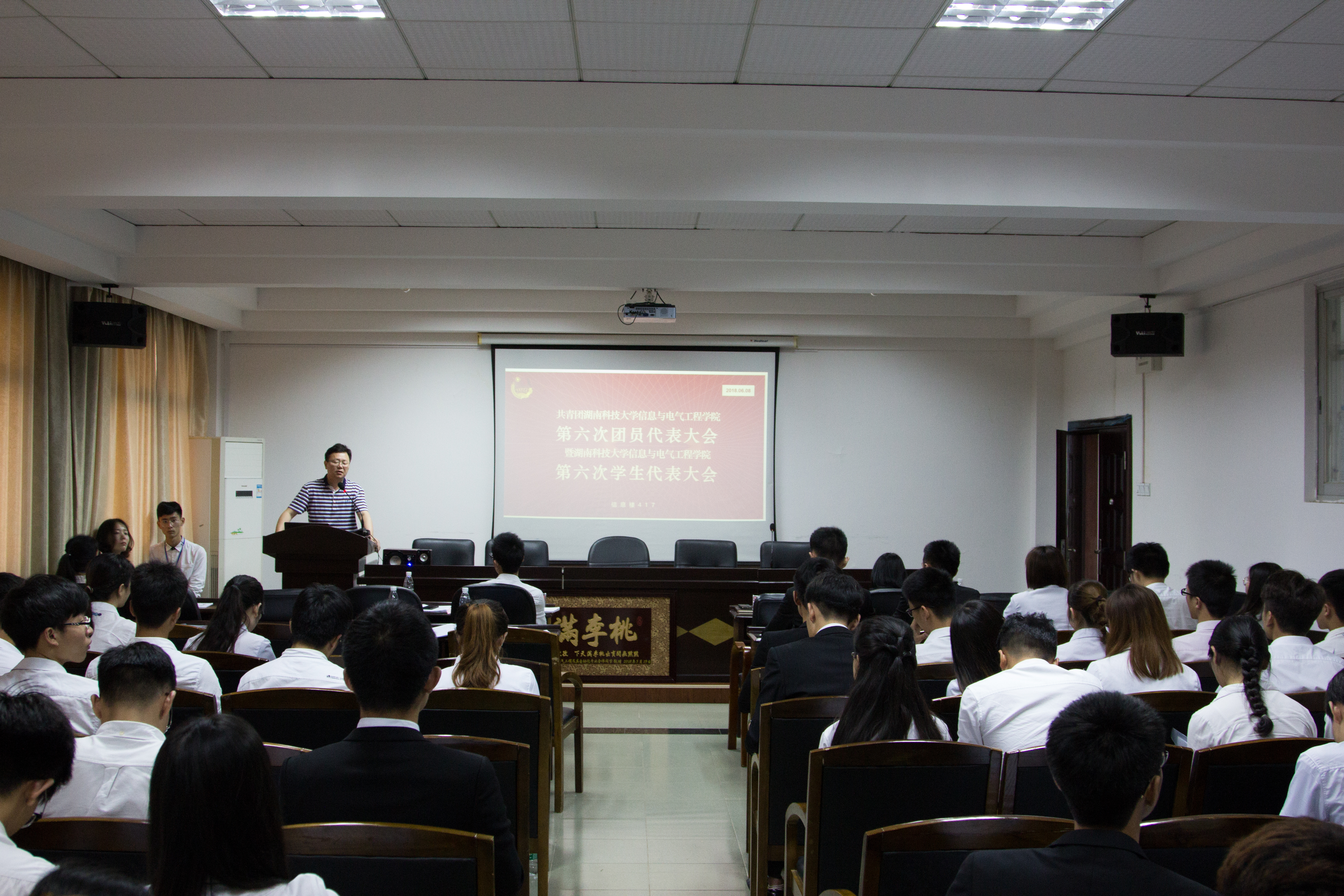6月8日14:30太阳成tyc33455cc(以下简称“信息学院”)于信息楼417举行共青团第六次团员代表大会暨第六次学生代表大会。信息学院党委副书记李宁、学工办主任杨金娥及团委书记倪士根出席会议。信息学院团委第一副书记田婧玮担任本次大会的主持人。