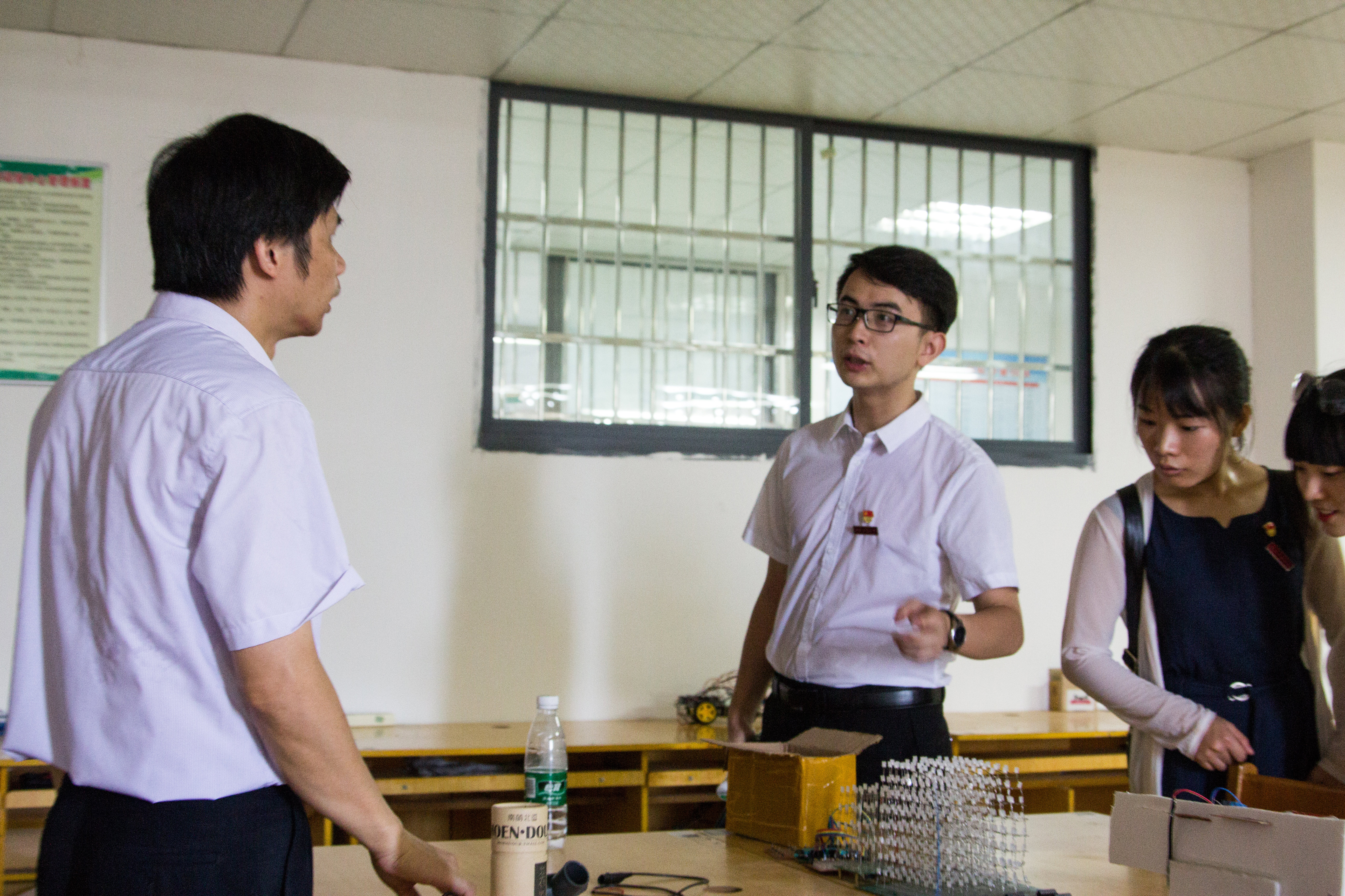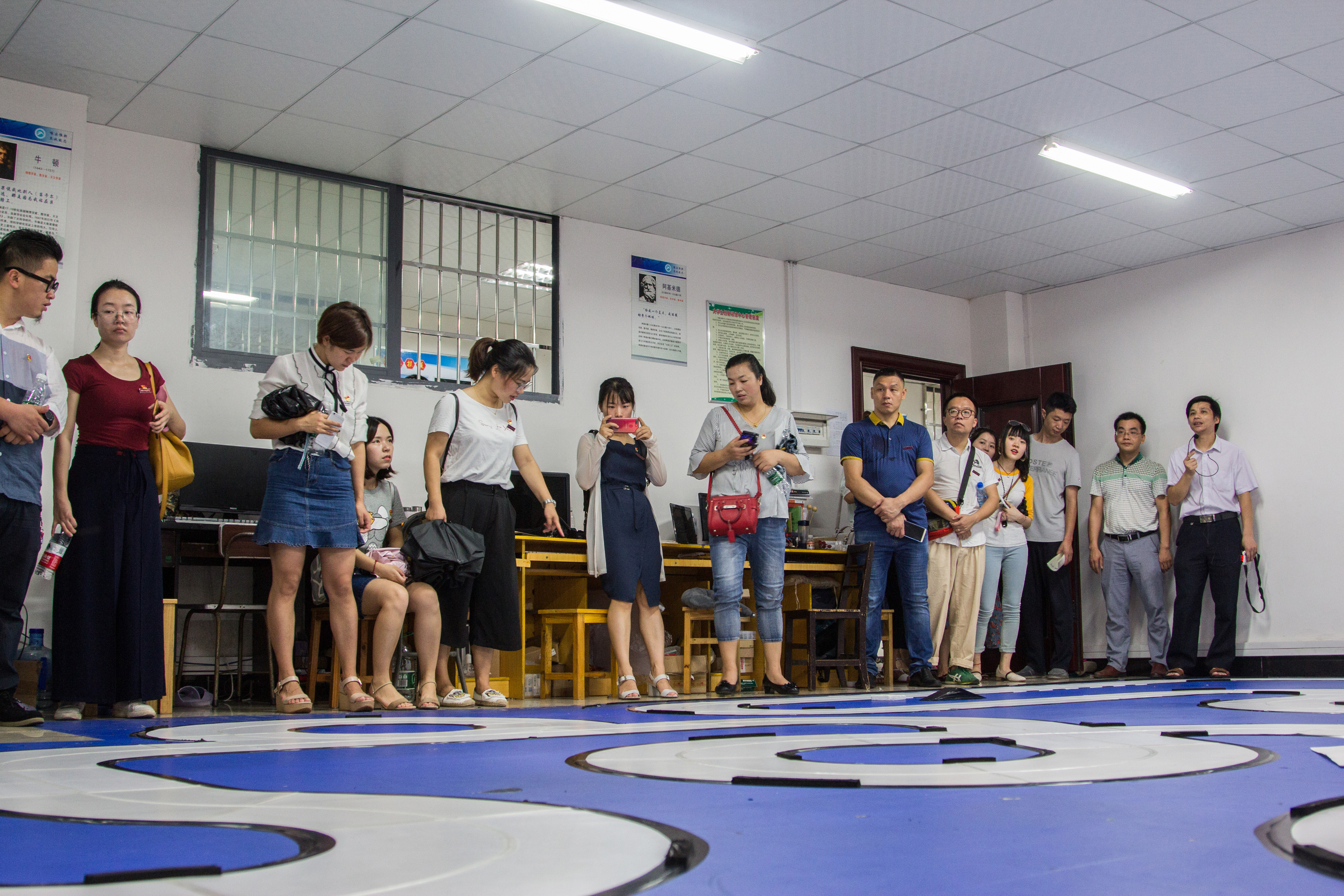 曾照福带领代表队依次参观了各个创新实验室并对每个实验室进行了详细解说。他介绍道:“我们的创新实验室主要分为现代电力电子技术创新实验室、智能机器人创新实验室、电力电子与电气传动实验室、物联网工程实验室、智能仪器仪表实验室、智能检测与自动化装置实验室、新能源开发与应用实验室、数字图像处理实验室、智能家居与智能电器实验室九大实验室,在实验室学习的同学们都十分刻苦努力,还有很多同学取得了国家级的奖项。在暑假期间,实验室的同学大多都申请了留校,继续在实验室里进行研究学习以及准备一系列的科技赛事。”随后,创新实验室的学生在测试室为大家进行了智能车演示。湖南文理学院师生代表们纷纷惊叹创新实验室的科研成果,并高度赞扬了实验室师生的科研创新精神。