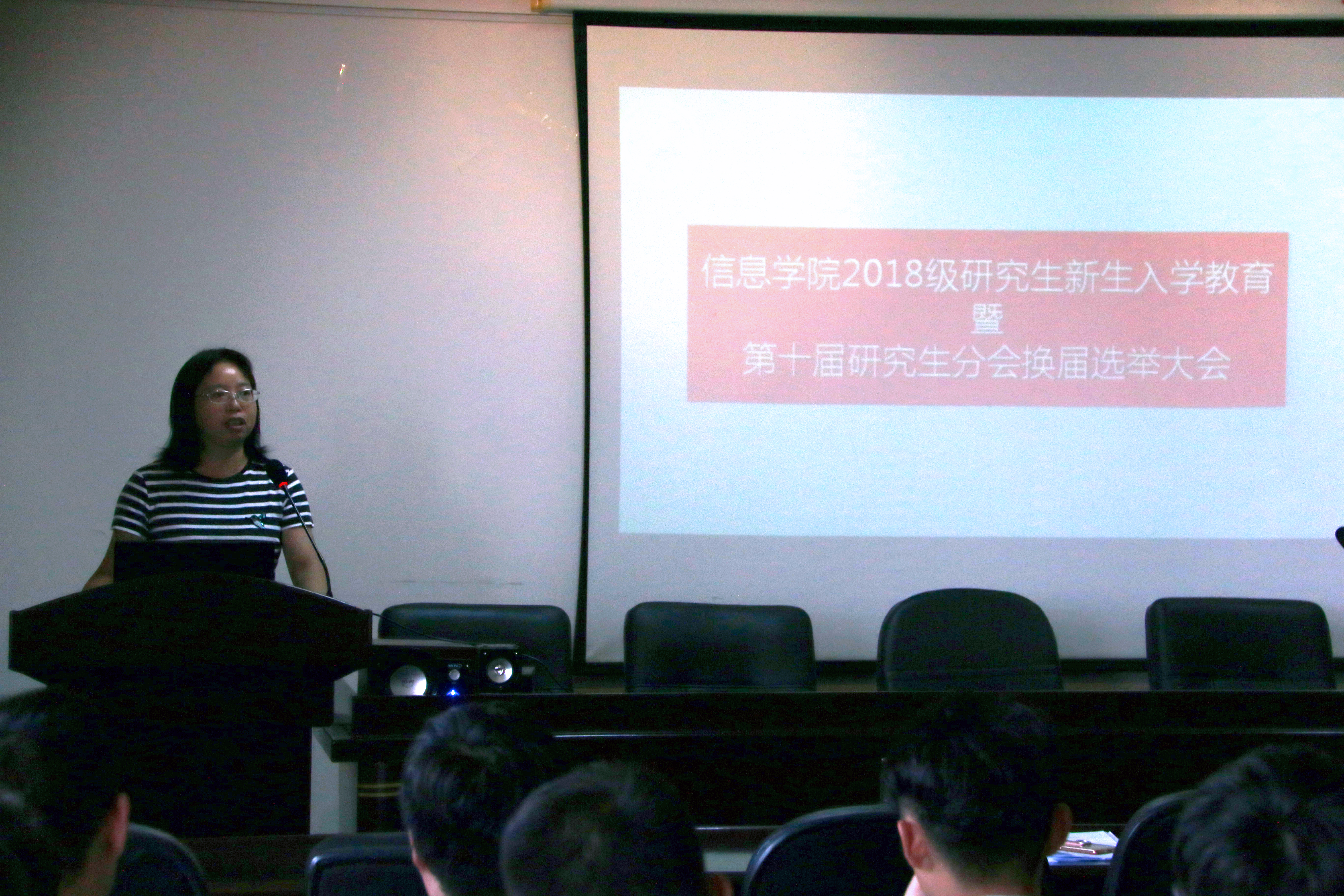 9月9日下午2:30,太阳成tyc33455cc(以下简称信息学院)在信息楼417召开2018级研究生新生入学教育暨第十届研究生分会换届选举大会。本次大会旨在让研究生新生了解学院的教学情况和研究方向,熟悉学院的管理制度,学会规范自我,突破自我。信息学院副院长周兰、院党委副书记李宁、学工办主任杨金娥出席本次大会,会议由杨金娥主持。