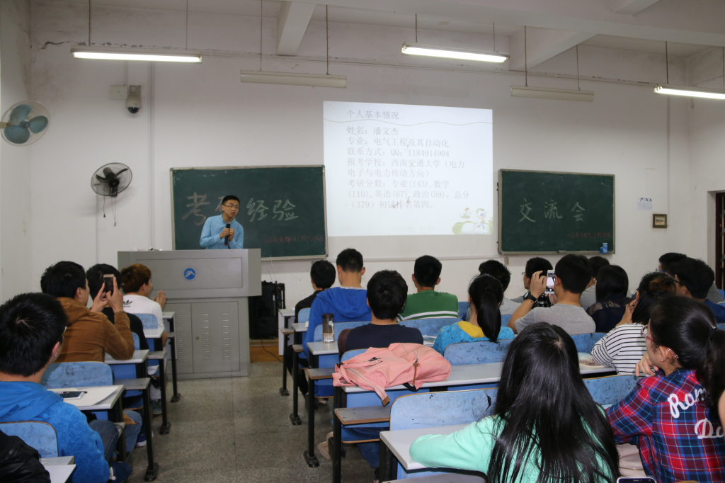会议伊始,彭辉老师首先祝贺我院考研成功的学生,介绍我院历年考研情况并希望大家认真对待本次考研经验交流会,她强调本次交流会对准备考研的同学来说非常重要,能帮助大家解决许多考研路上遇到的问题,让同学们更全面的认识考研和就业情况,提供成功的考研就业经验,望同学们认真聆听,并提出自己的问题。接着,四位考研之星依次上台传授考研经验,他们以优异的成绩分别考入了中南大学、西南交通大学等高校,在此每个人针对一个专业方向对考研经验进行了交流:电气工程及其自动化专业潘文杰为我们介绍了专业流向和怎么学习数学,以及一些相关参考书;电子信息工程专业段誉重点介绍了面试的内容以及对策。之后考研之星们告诉同学们:首先要整体把握近几年考研的趋势,而后再处理细节,各个击破,真正做到考研方向不选错,考验知识点不漏过。