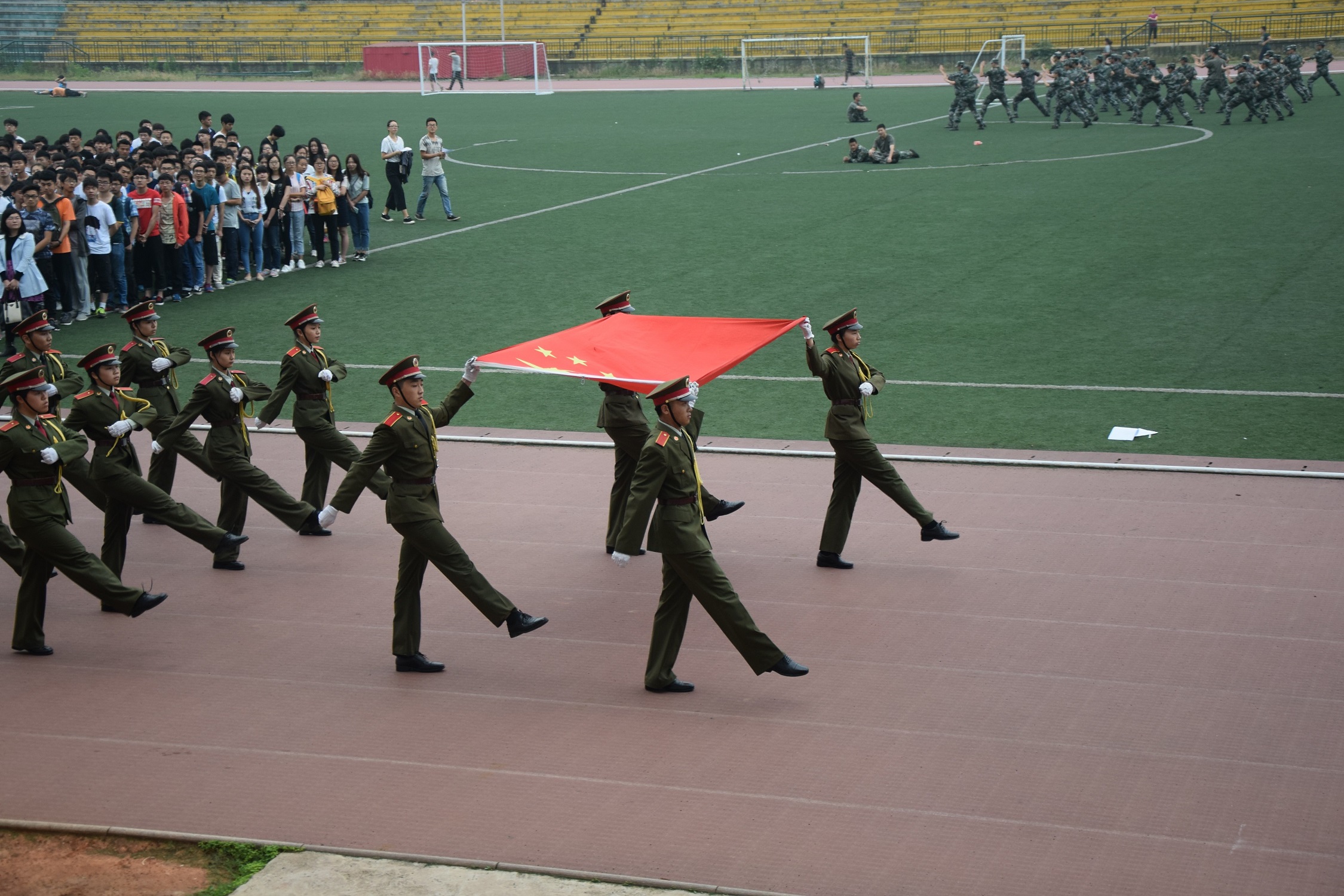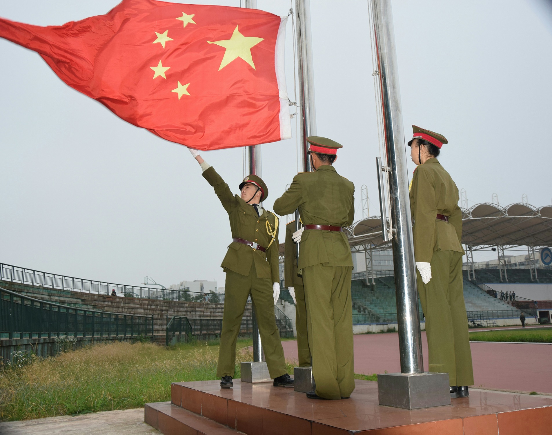七点整,在全体师生的注视下,英姿飒爽的信息学院国旗班旗手们迈着庄严的步伐,护送着国旗进场。行礼完毕,伴随着庄严沉重的《义勇军进行曲》,五星红旗冉冉升起,迎风飘扬。在场的每一个人向国旗行注目礼,表达着对祖国无限的热爱和崇高的敬意。