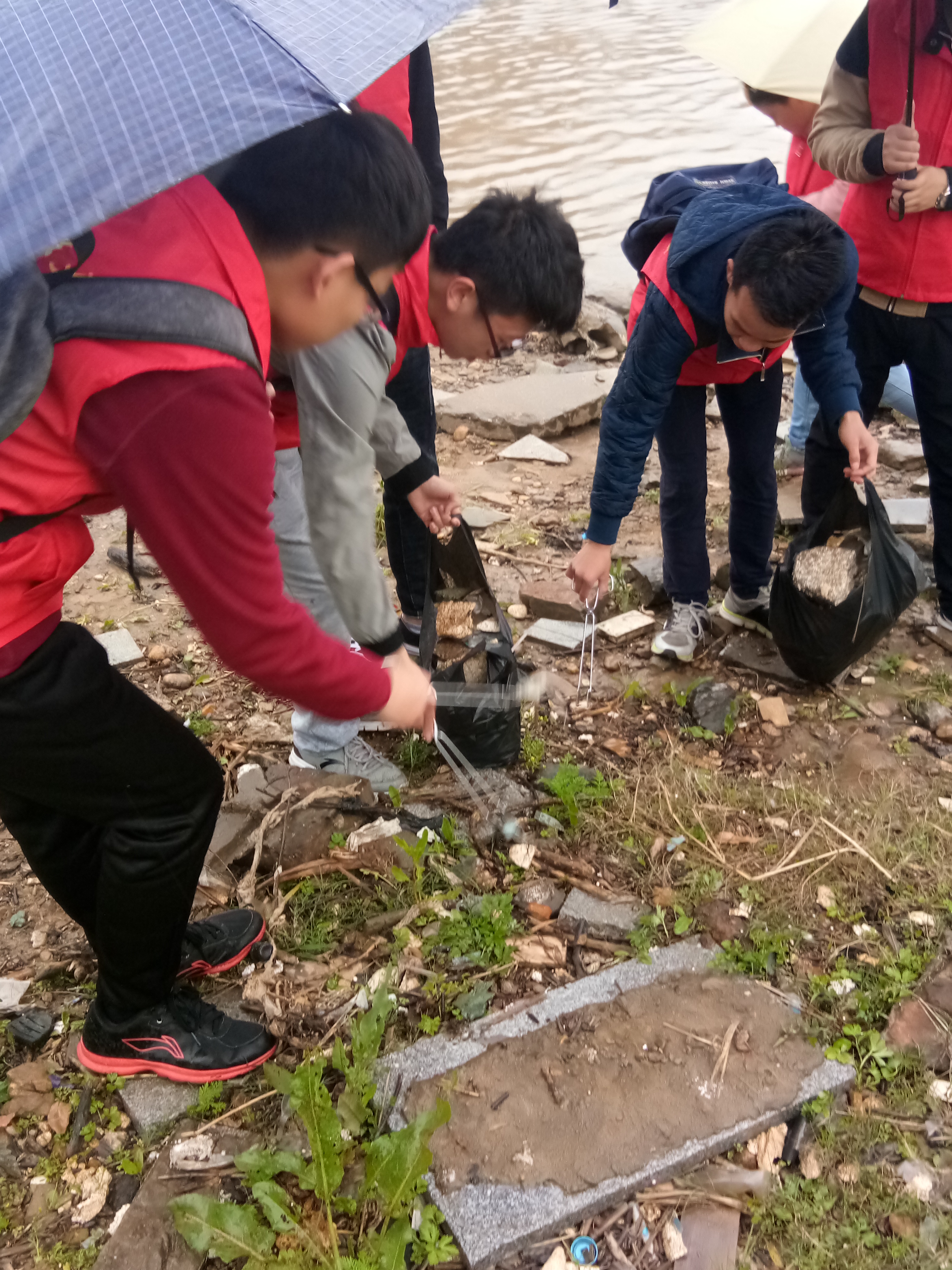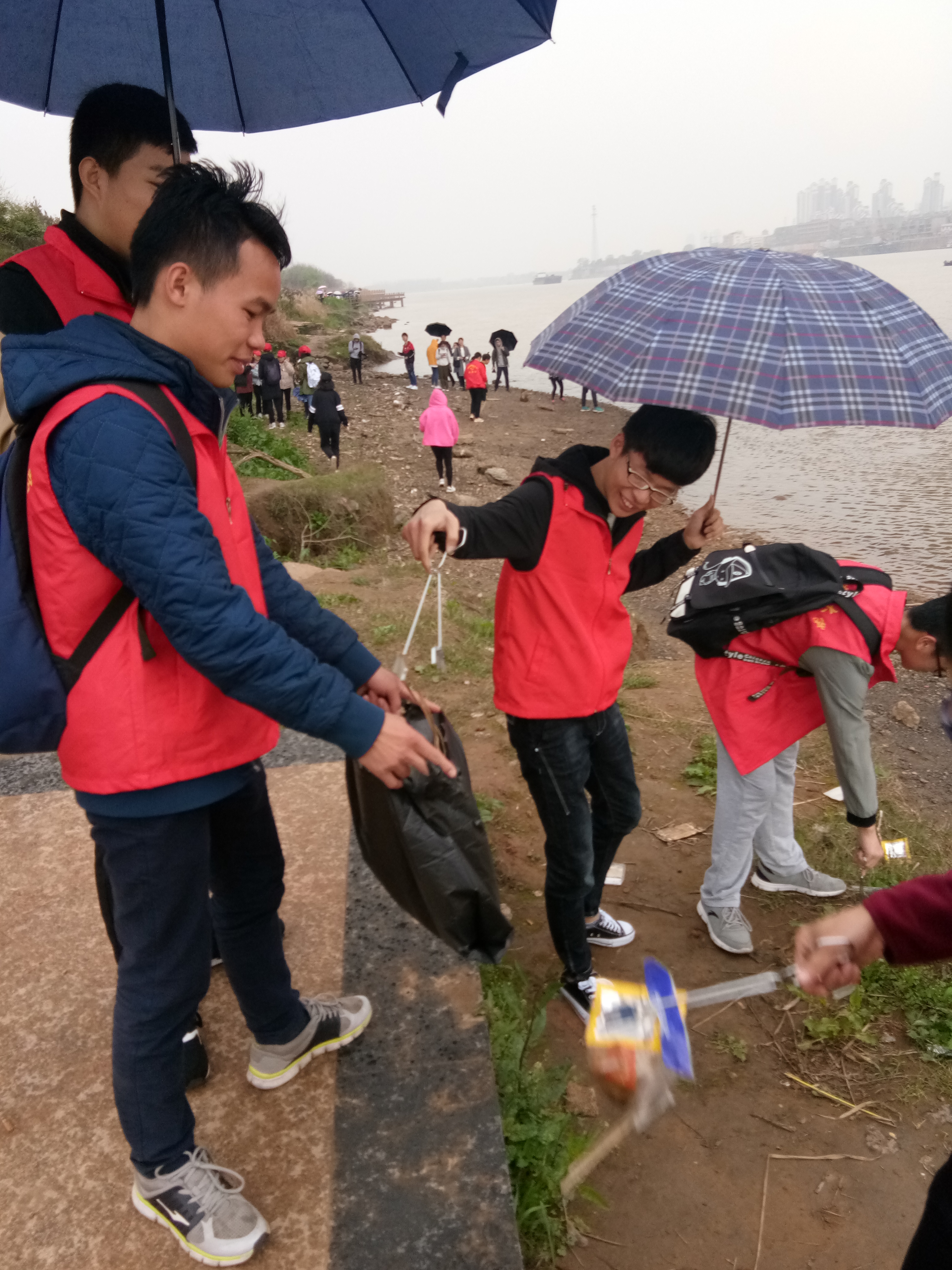 刚到江滩边,便下起了雨,但志愿者们并没有停下脚步,带上醒目的小红帽,两人或多人一组,相互合作,在指定的区域内清理江滩散落的垃圾,有些垃圾虽已有一半埋在了沙土里,但志愿者仍然尽力地把垃圾清理干净。此次活动虽然时间不够长,范围有限,但是各位志愿者们以自己的努力在有限的时间和空间内使活动取得了良好的效果。这一天,不止有志愿者们在行动,还有不少叔叔阿姨们放生,送小鱼们回家。在三月春雨的洗礼中,还湘江“一方净土”。