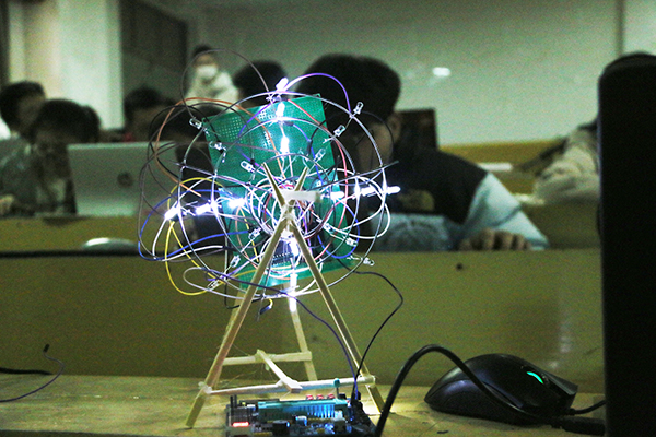 经过数小时的努力,参赛选手们终于完成了制作,并创作出了不少优秀作品。参赛作品形状各异,有圆形的,爱心形的灯光,还有摆成各种艺术字的独创设计等。这些作品一经完成,便会贴上写有队名的标签,交由两位技术部长陈家宁和廖国斌进行测试和评分。
