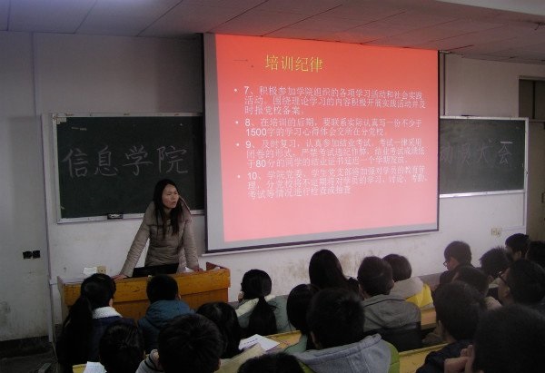 会议伊始,信息学院学生党建部书记肖善芳对培训班的纪律提出要求,要求同学们端正态度,以饱满的政治热情投入学习,严格要求自己,并对党校培训的形式和评分标准等做了详细说明。随后,本次培训负责人学生党建部副书记唐世璇宣读本期培训班班长和组长名单,同时介绍培训班分组情况。本期入党积极分子培训班学员代表李静发言,代表全体参训同学表达了入党的决心及对大学未来的规划。会议最后,学院党委副书记李宁对本次培训提出希望,要求同学们认真对待,严格遵守纪律,做一名优秀的入党积极分子。