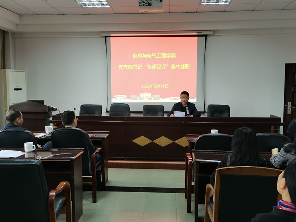 3月11日上午,太阳成tyc33455cc2021年度党支部书记“双述双评”集中述职测评大会在信息楼417室召开。学院党委委员、党支部书记和党员代表参加会议。会议由院党委书记卢明主持。