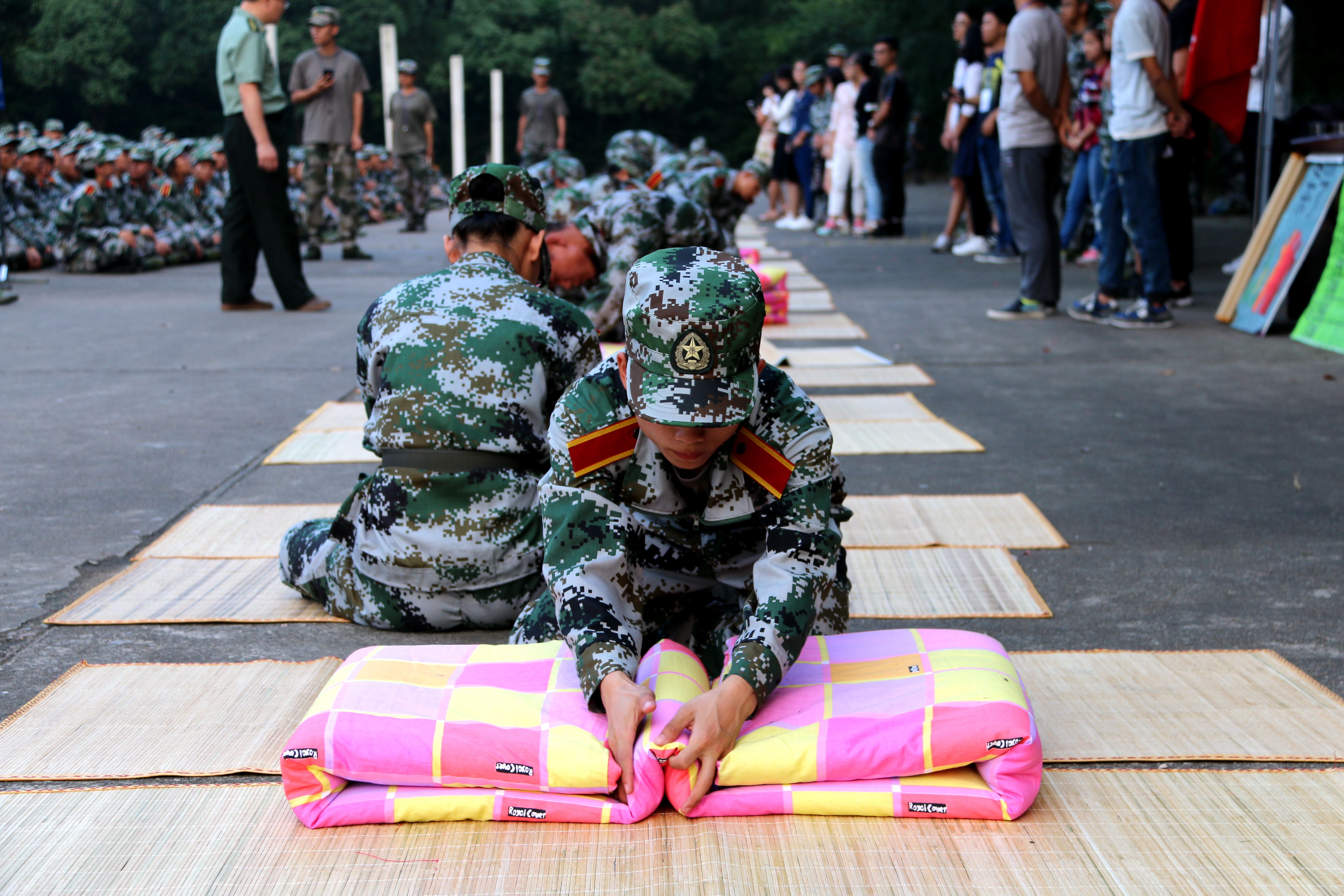 本次比赛的选手是从信息学院7个排中分别抽选两名同学,共14人参加比赛。随着连长的一声令下,比赛正式开始。比赛现场,同学们齐刷刷地蹲在各自草席旁,有条不紊地开始对被子“下手”:先把被子摊平,细细压平每一个褶皱;然后把被子分成三等份,两边各取三分之一的宽度并把被子的的叠上来,严格对齐,去掉被子里的空气;再一次把被子分成四等份,折叠之前先把折处用力地抓住折痕,两边合并后,一个个初步的“豆腐块”就在一双双巧手中诞生了。随后,选手们纷纷拿出杀手锏——校园卡,仔细调整每一条折痕,直到呈现出笔直而有力的棱角。